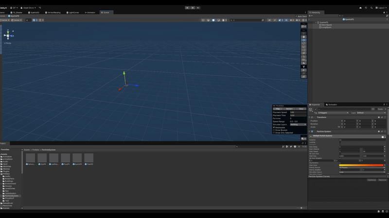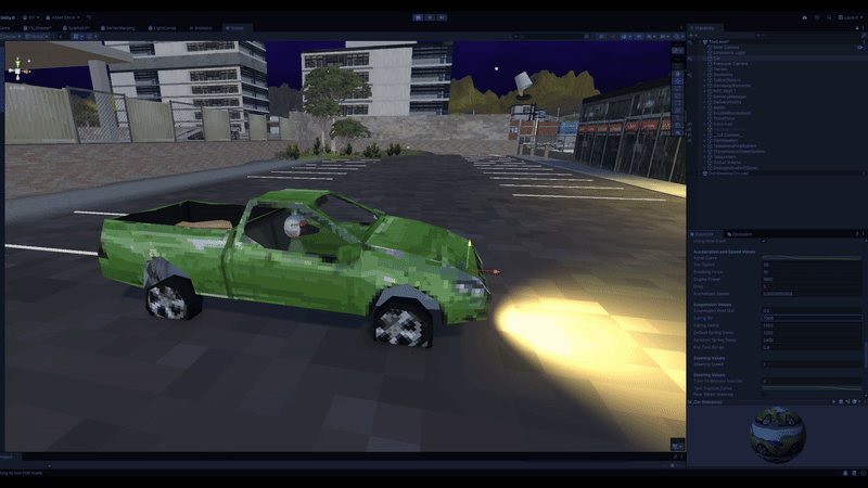 My core focus for the particle effects I made was to make sure they serve both the juice and the retro PlayStation-era aesthetic we were aiming for. Vertex jittering is a staple of PlayStation-era graphics and was something I put a lot of focus on early. While playing around with the jitter intensity I noticed that certain values lead to some crazy amounts of jitter and thought that it would provide a nice piece of player feedback when colliding with pedestrians and destructible objects; making the car wobble and shudder on these collisions. I compounded this with a spark particle effect as well as controller haptics to make collisions look and feel satisfying and impactful.